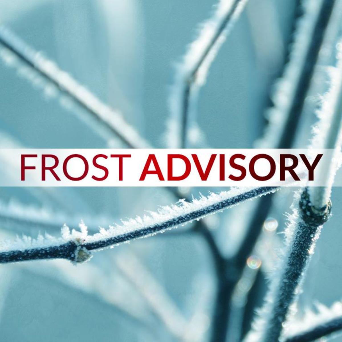 The National Weather Service issued the advisory, which is in effect until 9 a.m. Saturday. Forecasters said temperatures could drop as low as 33 degrees, leading to frost formation that could kill sensitive outdoor plants.